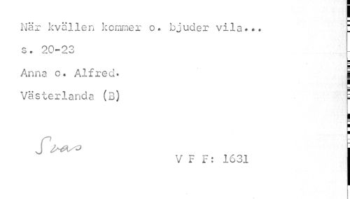 //// I //// När kvällen kommer o. bjuder vila... I s. 20-23 //// Anna o. Alfred» i //// Västerlanda (B) 1 //// J/^o i //// V F F: 1631 I ////