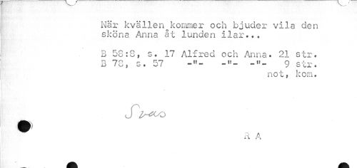 //// När kvällenokommer och bjuder vila den sköna Anna åt lunden ilar*.* //// B 58:8f s. 17 Alfred och Anna* 21 str. 3 78, s. 57 -"- 9 str. //// not, kom. //// oTV^co ////