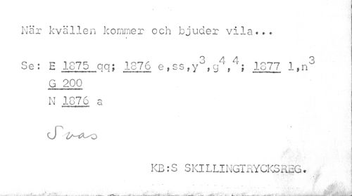//// När kvällen kommer och bjuder vila... //// » //// Se: E 1875 gg; .1876 e,ss,y3,g4,4; 1.877 l,n3 G 200 N 1876 a //// KB:S SKILLINGTRYCKSREG. //// i //// ¦ - - » — •' —*- - ....- - i-*. - --I--- - - --- ku/ ..'i----. _1___. A... M -"-XtifcU,____ . . U.UÉ ____ _____. ___^J ////