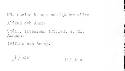 //// När qualen kommer och bjuder vilan Alfred och 'Anna. //// ¦ //// Smal., Tryserum, 175:172, s. 21. I //// Amman. j //// (Alfred och Anna) . I //// U L M A ////