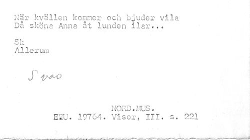 //// När kvällen kommer och bjuder vila Då skona Anna åt lunden ilar*,* //// Cl, //// O l\. //// Al lerum //// J i^O //// NORD. LUS. EEU. 19764. Visor, III. s. 221 //// • T • —^^..-...---—~—---—------—•—— ////