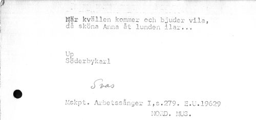 //// • ¦ ¦ //// • m - ? //// --" ' fä «. ,»,- v //// När kvällen kommer och bjuder vila, da sköna Anna åt lunden ilar... //// Up //// Söderbykarl //// ci //// Mskpt. Arbetssanger 1,5.279. E.U.19629 //// IJOfD. MUS. ////