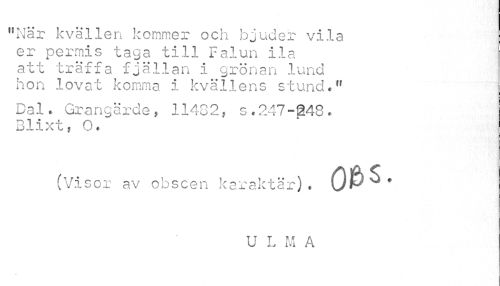 //// "När kvällen kommer och bjuder vila //// er permis taga till Falun ila att träffa fjällan i grönan lund hon lovat komma i kvällens stund." //// Dal. Grangärde, 11432, s.247-248. Blixt, O. //// (Visor av obscen karaktär). Q0 ^ * //// U L M A ////
