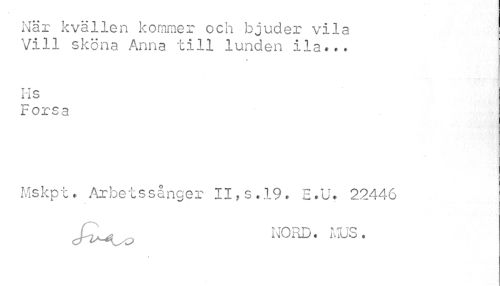 //// När kvällen kommer och bjuder vila //// Vill sköna Anna till lunden ila... //// t //// T'c 11 o //// Forsa //// Mskpt. Arbetssånger II,s.l9* E.U» 22446 //// ^iK^yQ NORD • IvUS • //// i ////