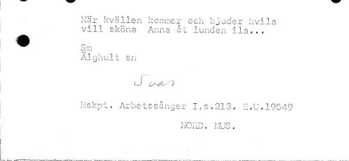 //// När kvällen kommer och bjuder hvila vill sköna Anna åt lunden ila... //// jM ML //// ^^ Sm //// • * //// Al ghult sn //// <J //// Mskpt. Arbetssånger I,c.213. E.U.19549 //// NORD. MUS, //// — ¦». Jv/*"'r" K"> »-^IJ .^rrV^lvV . . ____ 1 .» . .. _____ W-—. i. . _ .„_A\ J___ .' _ A -__...____. „ .--— _ _ . .... ////