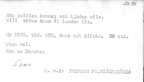 //// ju //// När kvällen kommer och bjuder vila, //// vill sköna Anna åt lunden ila, 1 //// Nr 1539, sid. 692, Anna och Alfred, 20 str. //// Utan mel. Kom av Deneker //// J //// H. o.E: FOLKM:N FR.KLÄCKE3ÄRGA ////