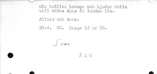 //// När kvällen kommer och bjuder hvila vill sköna Anna åt lunden ila. //// Alfred och Anna. //// 20:4. SO. Brage 13 nr 23. //// Ji o ////
