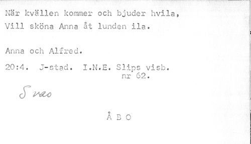 //// När kvallen kommer och bjuder hvila, Vill sköna Anna åt lunden ila. //// i //// Anna och Alfred. //// 20:4. J-stad. I.N.E. Slips visb. //// nr 62. //// C) //// O //// A B O ////