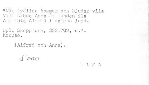//// "När kvällen kommer och bjuder vila Vill sköna Anna åt lunden ila Att möta Alfrid i dalens lund. //// Upl. Skepptuna, 303:702, s.7. Kruuse« //// (Alfred och Anna). //// U L M A ////