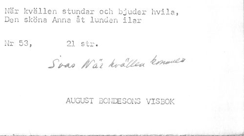 //// När kvällen stundar och bjuder hvila, Den sköna Anna åt lunden ilar //// Nr 53, 21 str. //// AUGUST BONDESONS VISBOK ////
