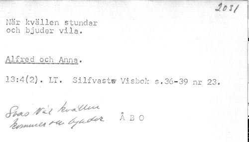 //// UDif //// När kvällen stundar och bjuder vila. //// ¦ i //// Alfred och Anna. //// 13:4(2). LT. Silfvast® Visbok s.36-39 nr 23. //// m ////
