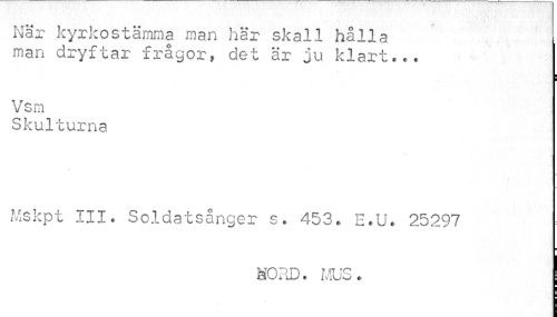 //// När kyrkostämma man här skall hålla man dryftar frågor, det är ju klart... //// Vsm //// Skulturna //// Mskpt III. Soldatsånger s. 453. E.U. 25297 //// MORD. MUS. //// i ////