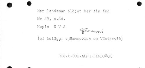 //// Ner landsman plöjat har sin äng Nr 49, s.64. Kopia SVA //// (ej belägg, sjömansvisa om Västervik) //// REG.t.JOH.ALFR.LINDBÄCK ////