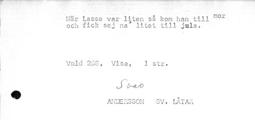 //// I* //// r //// När Lasse var liten så kom han ti 11 nor och fick sej na' litet till jala. //// 4 //// Vmld 263, Visa, 1 str. //// S ls~tLA> //// ANDERSSON SV. LÅTAR ////