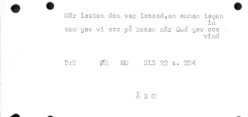 //// När lasten den var lossad,en annan tagen //// * *m //// /i n //// sen gav vi oss på resan när Gud gav oss v: //// vind //// 5:8 0R WJ SLS 22 s* 204 //// ÅBO ////