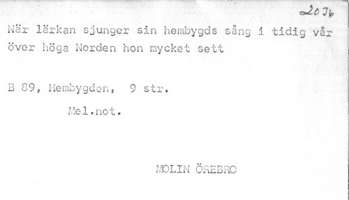 //// oLO Jfe //// När lärkan sjunger sin hembygds sång i tidig vår över höga Norden hon mycket sett //// B 89? Hembygden, 9 str* //// Mel.not. //// MOLIN ÖREBRO ////