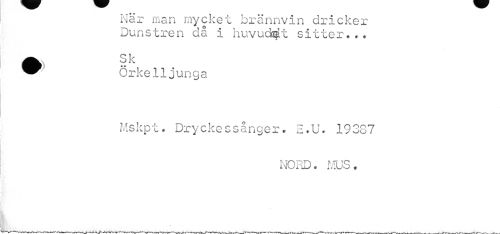 //// När man mycket brännvin dricker Dunstren då i huvudet sitter... //// • Q]r //// ' Örkelljunga //// Mskpt. Dryckessånger. E.U. 19337 //// NORD. MUS* ////