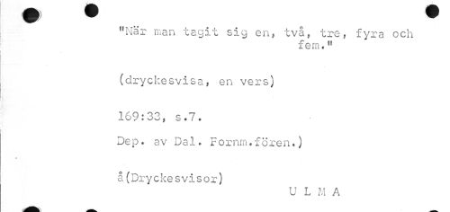 //// "När man tagit sig en, två, tre, fyra och //// fem." //// (dryckesvisa, en vers) 169:33, s.7. //// Dep. av Dal. Fornm.fören.) //// å(Dryckesvisor) //// U L M A ////