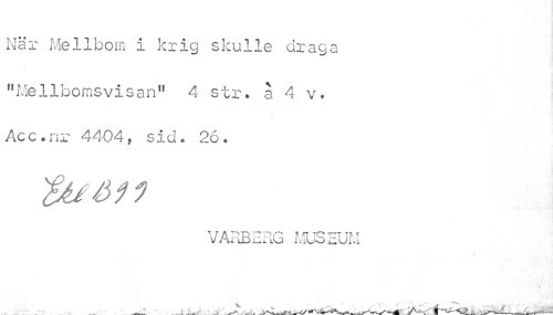 //// När Mellbom i krig skulle draga "Mellbomsvisan" 4 str» a 4 v. //// r //// Acc.nr 4404, sid. 26. //// VAKBERG MUSEUM //// > ¦ 'ty;' • //// • t v - JJL A- U ^ ////
