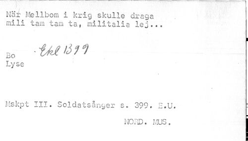 //// _ //// När Me11bom i krig skulle draga mili tam tam ta, militalia lej... //// bo iMMt //// Lyse //// \ //// » //// Mskpt III. Soldatsånger s. 399. E.U. : //// ¦ //// NORD. MUS. I ////