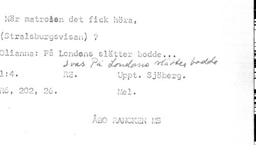 //// När matroåen det fick höra t - //// * ¦ //// [Stralsburgsvisan) ? //// )liaana: På Londons slätter bodde... , i //// J istLA ?cC rta Vitu | //// L:4. RH. Uppt. Sjöberg. ! //// 16, 202, 26. Mel. i //// v _ //// ÅBO RANCKEN MS I //// / I1 ////