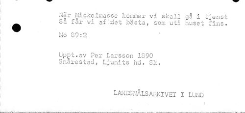 //// När Mi eke linas se kommer vi skall gå i tjenst Sa far vi af'det bästa, som uti huset fins. //// No 89:2 //// Upgt.av Per Larsson 1890 Snarestad, Ljunits hd. Sk. //// LANDSMÅLSARKIVET I LUND //// • - . y //// i ////
