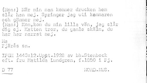//// (Hon:) När min man kommer drucken hem :: //// slår han mej. Springer jag uti kammaren och gömmer mej. //// (Han:) Kom,kom du min lilla vän* jag slår ; //// dig ej. Katten tror, du gamle skälm, du //// har har narrat mej. ' //// ¦ //// Ha.. o : //// Fjärås sn. i //// IFGH 1443:12.Uptfjt. 1928 av bh.Stenbock ! //// eft. fru Matilda Lundgren, f.1350 i Fj. //// D 77 NORD.MUS. ////
