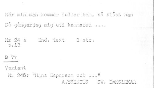 //// När min man kommer fuller hem, så slåss han Då gångarjag mig uti kammaren .... //// Nr 24 a End. text 1 str. //// o 1 O, //// W ? JU //// Uff //// Variant //// Nr 245: "Hans Espersom och ..." //// ou f\ atvtc t i^is a //// * io^ijuo o v • u ai nio lii i v/ui ////