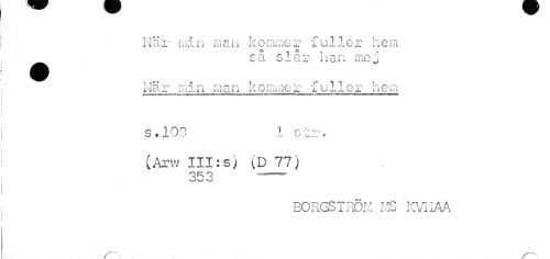 //// När min man kommer fulier hem //// så slår han mej //// När min man kommer fulier hem //// HlWiTilWHIT ""HIHH- II"»T 'I f '' TT1-- imiMii TV'-»-mi iiiin^Mi* 'iiK>ii||lHii»'illiBi B Wi^l H W"IH<iWi '<11111 n //// S.103 i str. //// (Arw III:s) (D 77) //// 35 o. //// BORGSTRÖM MS KVHAA //// ^ - ////