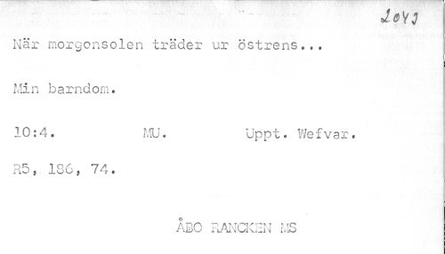 //// 4O V J //// När morgonsolen träder ur östrens... Min barndom. //// 10:4. MU. Uppt. V/ef var. //// R5, 186, 74. //// ÅBO EANCKZN MS ////