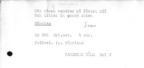 //// ¦ C ' //// , — - —---T //// ... //// När månen vandrar på fästet blå Och tittar in genom rutan //// Månvisa Cf ...-... ) //// Nr 206 Mel.not. 5 str. Folkmel. fr. Värmland //// Q SANDBERG SANG Del 3 ////