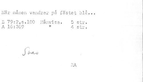 //// När manen vandrar på fästet blå... //// B 79:2,s.180 Månvisa. 5 str. A 16:369 " 4 str. //// J U-O-sQ //// RA //// j ////