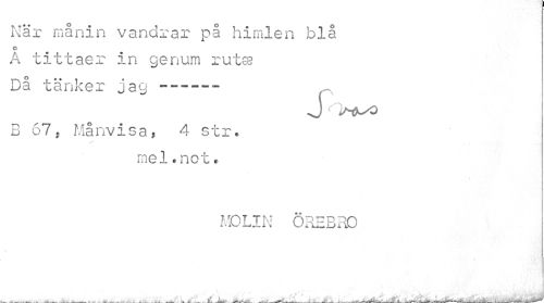 //// När manin vandrar på himlen blå //// c //// A tittaer in genum rutss Då tänker jag ------ //// J >*-<<> //// B 67j Månvisa, 4 str. //// mel. not. //// MOLIN ÖREBRO ////