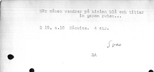 //// När månen vandrar på himlen blå och tittar //// in genom rutan.«. //// B 15, s.13 Månvisa. 4 str. //// 0 ////