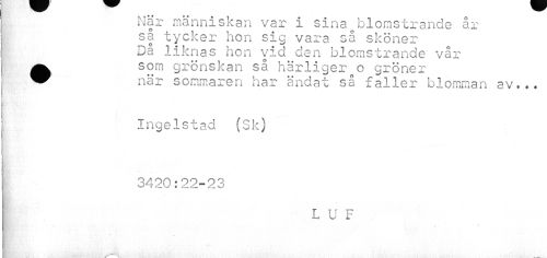 //// När människan var i sina blomstrande år så tycker hon sig vara så sköner //// c* ** //// Da liknas hon vid dan blomstrande vår //// •som grönskan så härliger o gröner //// när sommaren har ändat så faller blomman av... //// Ingelstad (Sk) 3420:22-23 //// L U F //// 4 ////