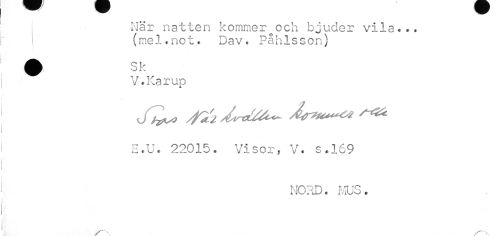 //// När natten kommerooch bjuder vila*., (mel.not. Dav* Påhlsson) //// ^ V.Karup //// E.U. 22015. Visor, V. s.169 //// NORD. MUS. ////