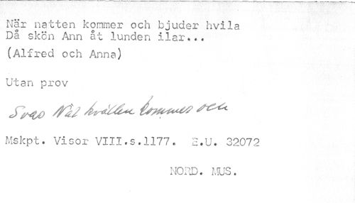 //// När natten kommer och bjuder hvila ua skon Ann at lunden ilar... //// (Alfred och Anna) Utan prov //// Mskpt. Visor VIII.s.1177. £.u. 32072 //// NORD. MUS. ////