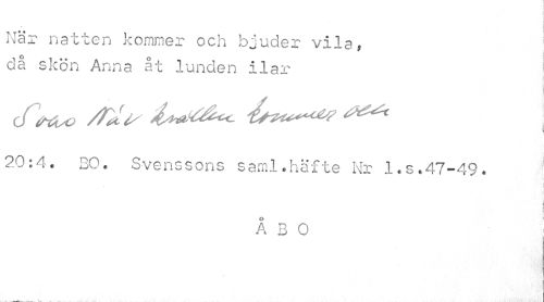 //// När natten kommer och bjuder vila, då skön Anna åt lunden ilar //// 1 //// cC**A> /tJ,> *** //// 20:4. 30. Svenssons saml.häfte Nr l.s.47-49. //// I i //// I //// ÅBO //// - //// ¦ //// . < ////