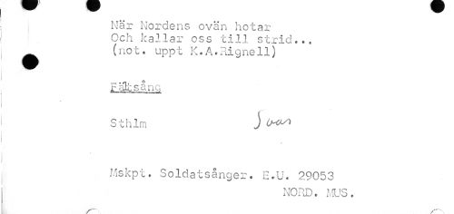 //// När Nordens ovän hotar Och kallar oss till strid.., ^ (no t ? upp t K * A. Ri g ne 11) //// Fätesang //// St him J //// i //// i //// Mskpt. Soldatsånger. E.U. 29053 //// NORD. MUS. //// __ ////