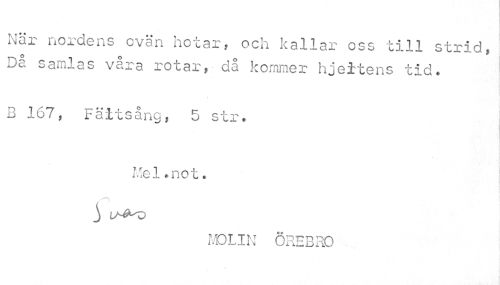 //// När nordens ovän hotar? och kallar oss till strid, Då samlas våra rotar, då kommer hjeitens tid. //// ! //// B 167, Fäitsång, 5 str. //// Me1.not» //// ^ U-^O //// MOLIN ÖREBRO ////