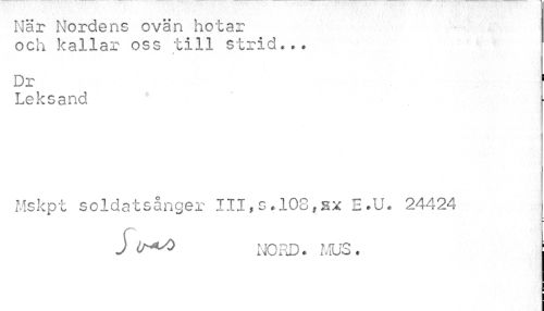 //// När Nordens ovän hotar och kallar oss till strid... //// Dr //// Leksand //// Mskpt soldatsånger III,s.l08,sx E.U. 24424 //// j ir-^O NORD. MUS. ////