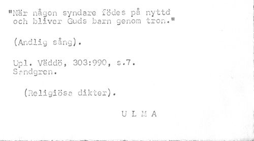 //// "När någon syndare födes på nyttd och bliver Guds barn genom tron." //// | //// (Andlig sång). //// i //// Upl. Väddö* 303:990, s.7. | //// Sandgren. //// i //// i //// i //// i //// (Religiösa dikter)» //// U L M A //// --- -----*----- - .. ------— * ---- .....—------- . ------- ^___ ____ _____ . ____ ____ . _ ... ii. ti___^ ////