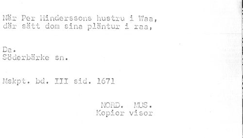 //// I //// I //// När Por Hinderssons hustru i Waa, där sätt dom sina pläntur i raa, //// i //// Da * //// Söderbärke sn. //// Mskpt.. bd. III sid. 1671 //// NORD. MUS. Kopior visor ////