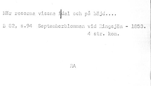 //// När rosorna vissna iidal och på höjd.... //// B 82, s.94 Septemberblomman vid Ringsjön - 1853. //// 4 str. kom. //// RA //// i j //// » \ ////