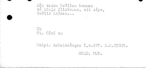 //// När sedan kvällen kommer så^börja flickorna, att såpa, ^ tvätta halsen... //// q v //// O A. //// St. Olof sn //// Mskpt. Arbetssånger I,s.827. E.U.22335. //// NORD. MUS. ////