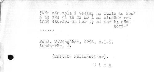 //// . . .. //// fefNär säri sola i vester ha rulla te kos" A ja ska gå te mi mö å mi elskäde ^ros inga stövler ja har ty mi mor ha däm //// gömt«" //// Sdml. V.Vingåker, 4295, s.1-2. Lundström, J. //// ^^ (Enstaka kärleksvisor). //// U L M A ////