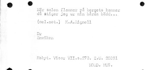 //// När solen flammar på bergets kammar då stiger jag ur min hårda bädd..., //// (me 1* not •) K«A. Rigne 11 Dr //// Enviken //// Mskpt. Visor VII.s.273. E.U. 23891 //// NOivD. MUS . ////