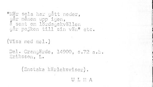 //// I //// ¦ //// "När sola har gått neder, cjår månen upp igen, aosent om lördagskvällen //// går pojken till sin vän" etc» \ //// (Visa med mel.) //// i //// Dal* Grangärde, 14900, s,72 a»b, s //// Eriksson, L. . //// (Enstaka kärleksvisor). //// « //// U L M A ////