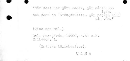 //// "Nar sola har gått neder, går månen upp //// igen * //// ö //// ^^ och sent om lördagskvällen gar pojken till //// sin vän.11 //// (Visa med mel.) //// Dal< Grangärdef 14900* s.57 a-b« //// T? T* n \r ct c* r\ n //// XiVvJ O WU f Iji //// (Enstaka kärleksvisor), //// U L M A //// . /---. ////
