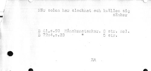 //// j //// I //// r //// f //// ^ När solen har slocknat och kvällen sig //// J sänker //// / ! : //// J //// B 61,s.93 Månskenstankar. 3 str. mel. B 72:4,s.23 • " 5 str. //// v //// RA . //// * ////